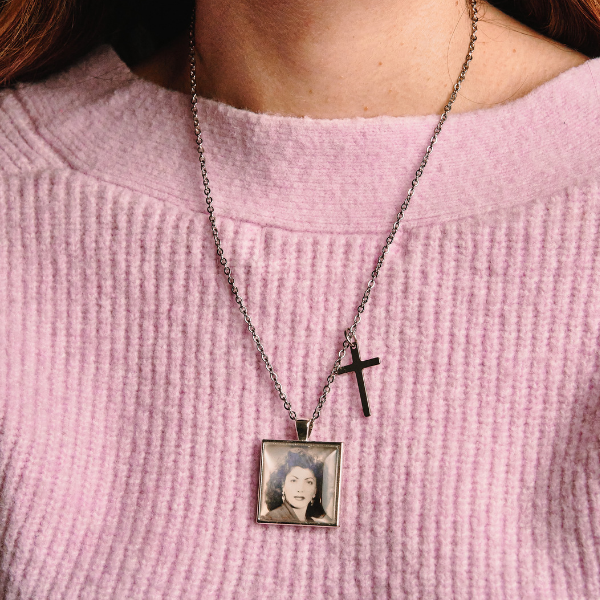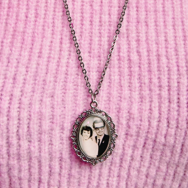 La cadenita es de acero inoxidable. El dije es de aleación de metales. La fotografía es protegida con resina epóxica y vidrio para darle un hermoso y fino acabado.