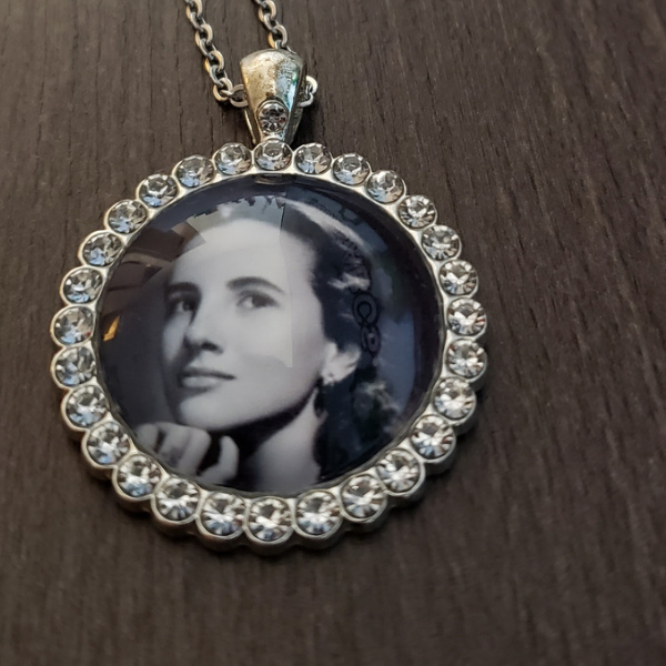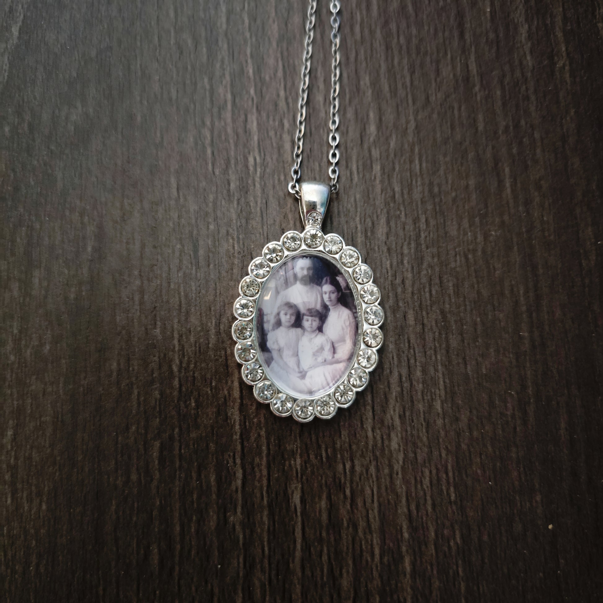 La cadenita es de acero inoxidable. El dije es de aleación de metales con cristales brillantes incrustados. La fotografía es protegida con resina epóxica y vidrio para darle un hermoso y fino acabado.